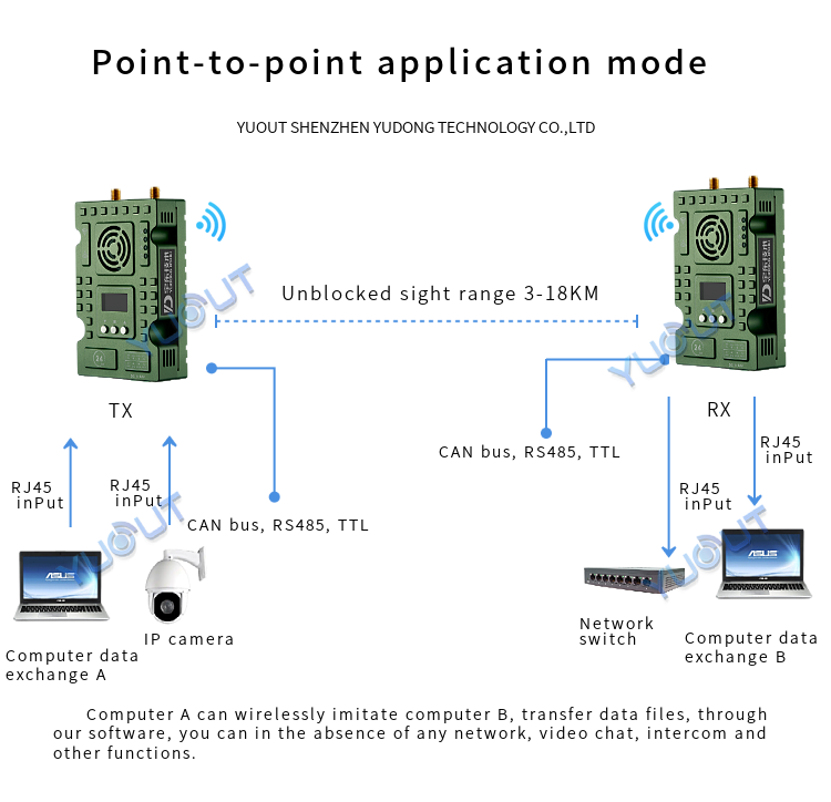 YD-TD9008-DT wireless broadband transmission radio adopts industrial-grade wireless high-speed data transmission technology, non-line-of-sight, non-wifi, set orthogonal frequency division multiplexing TDMA and MIMO multi-input and multiple-output capacity technology, completely based on IP Internet protocol, to achieve full bidirectional transparent channel broadband transmission. Non-visual distance: 300-900 meters; Ground visual distance: 2-18 km. The system is pure hardware connection, plug and play; Innovative LCD integrated design, rich CAN bus, RS-485, TTL level interface, better user perspective experience. The channel supports a maximum of 30Mbps of swallowing and spitting, and can be widely used in industrial automation, industrial robots, drones and other communication work.